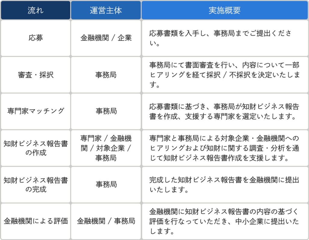本事業では、事務局並びに弁理士等の専門家が中小企業の「知財ビジネス報告書(※)」作成を支援し、金融機関の皆様に同報告書の内容に基づいた評価を実施いただいた上で、その評価結果を中小企業の皆様へ提供いたします。